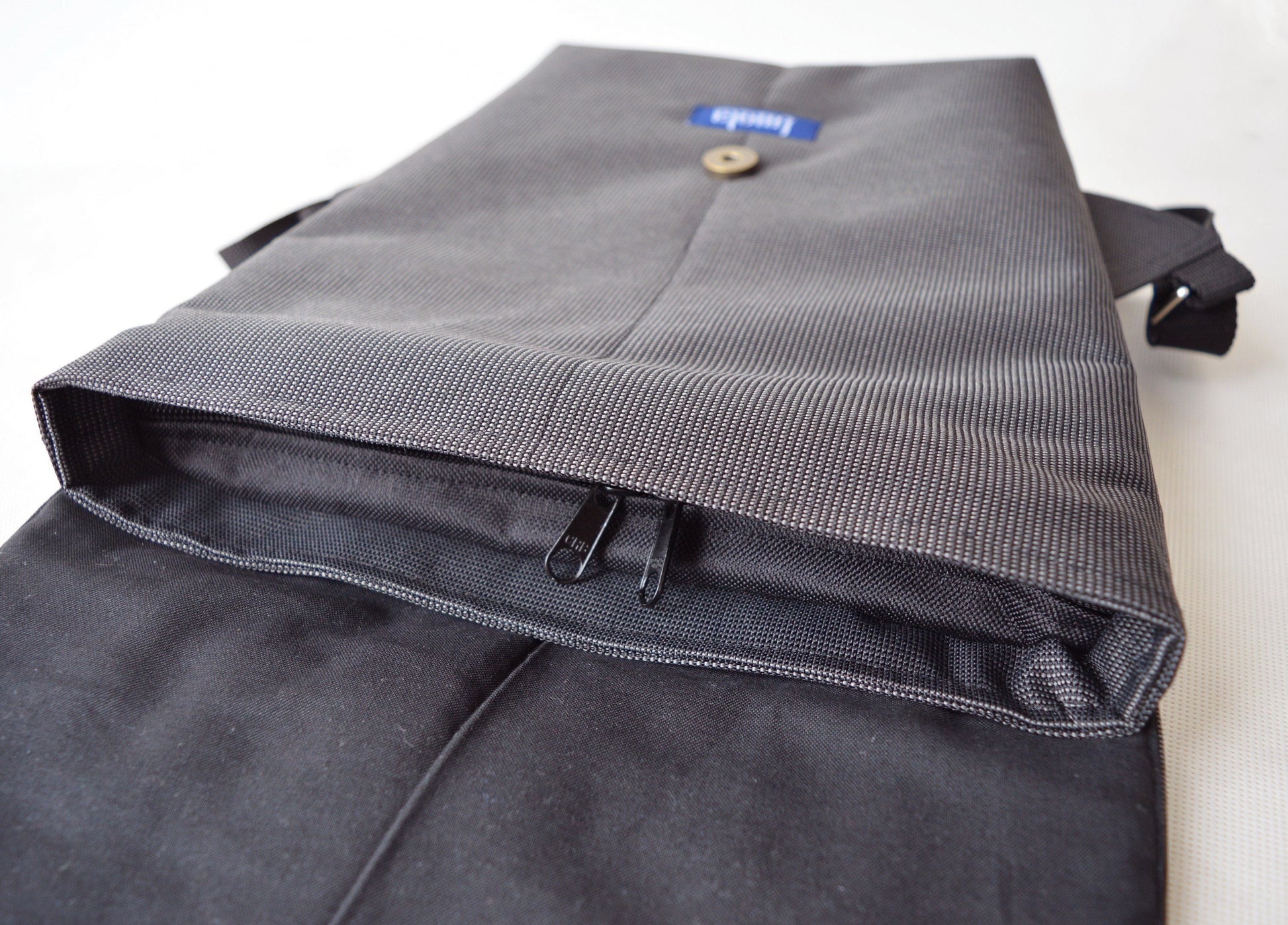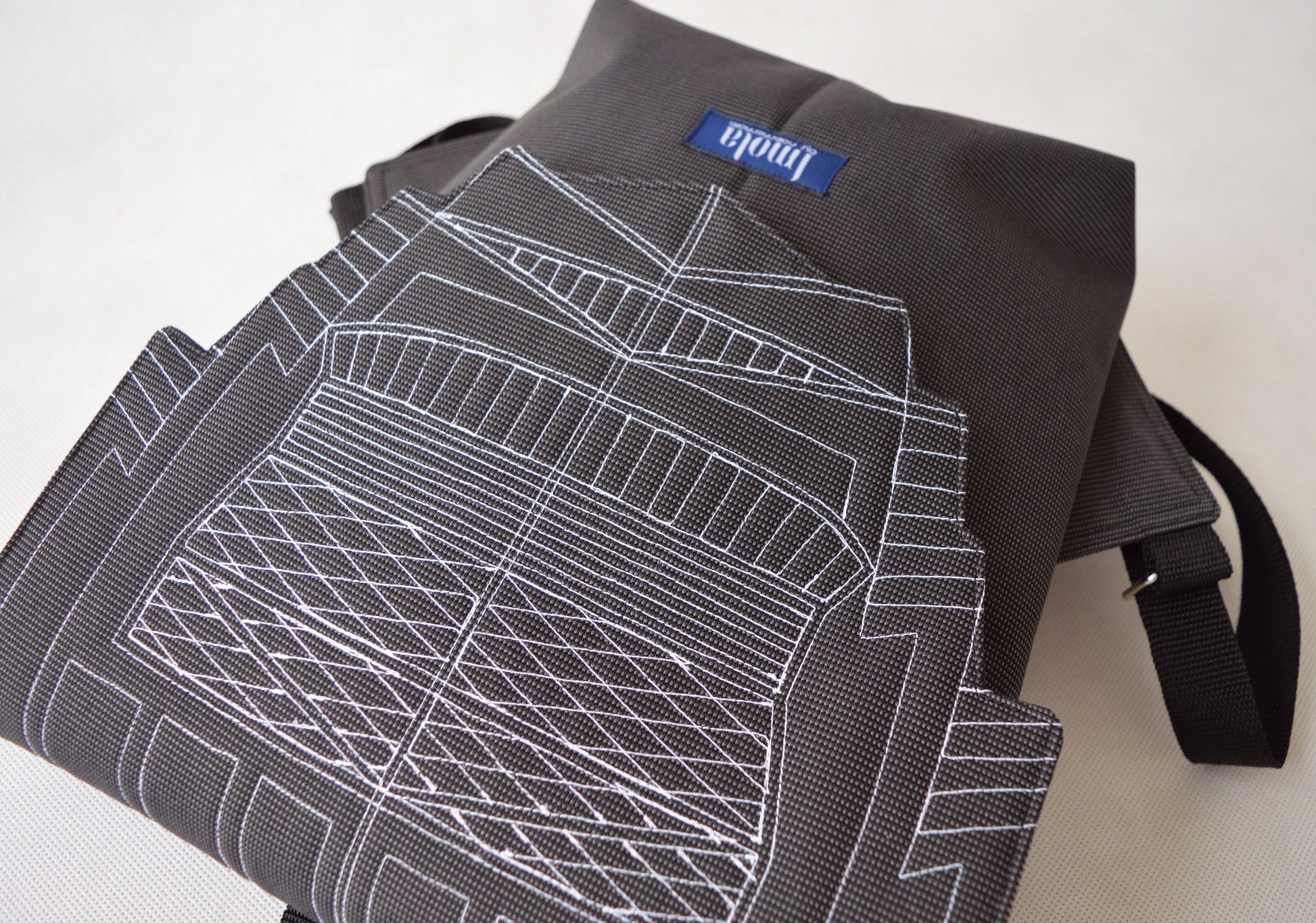 Backpack dark grey hipster backpack rucksack cycling bag waterproof small mini backpack Zurichtoren geometric simple minimalist backpack. It's made from two-tone black-gray waterproof cordura. Pockets on the lining. The bag has two way zipper and magnetic closure. It's a perfect everyday small bag.