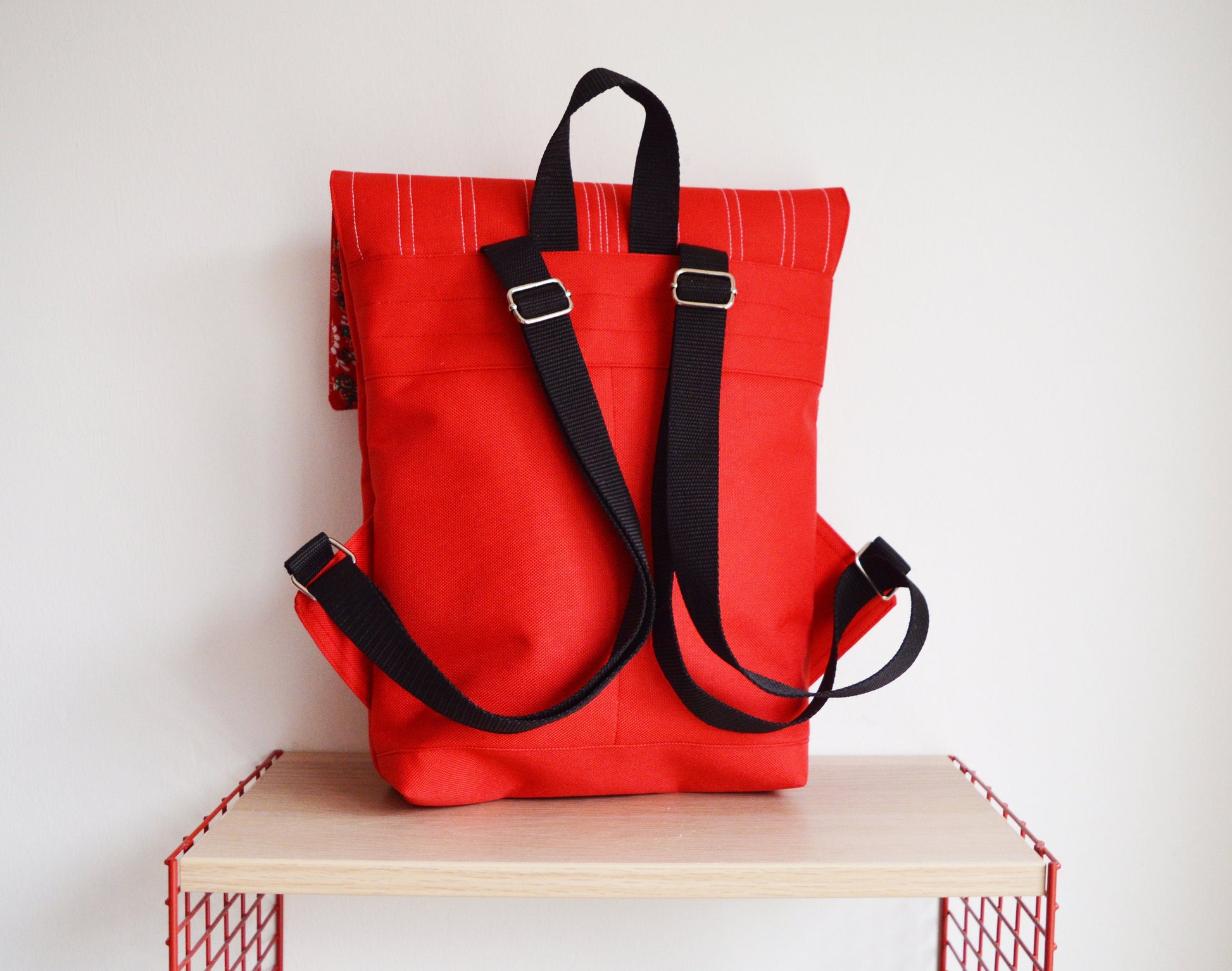 Backpack hot red black hipster backpack rucksack cycling bag waterproof small mini backpack Zurichtoren geometric simple minimal bag chili paprika. It's made from hot red waterproof cordura. Pockets on the lining. The bag has two way zipper and magnetic closure. It's a perfect everyday small bag.