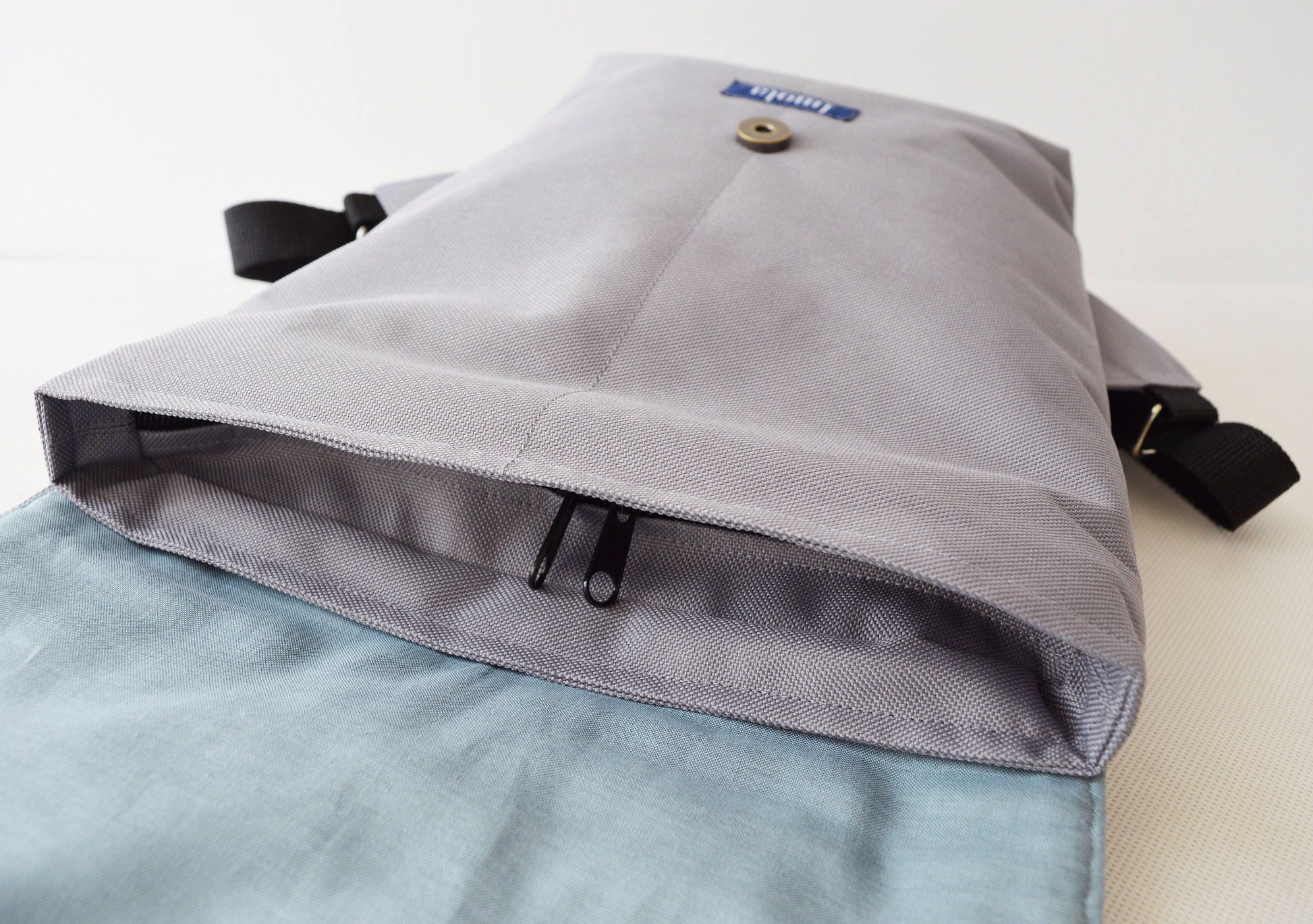 Backpack light gray hipster backpack rucksack cycling bag everyday small mini backpack Zurichtoren geometric simple minimalist backpack. It's made from light grey waterproof cordura. Pockets on the lining. The bag has two way zipper and magnetic closure. It's a perfect everyday small bag.