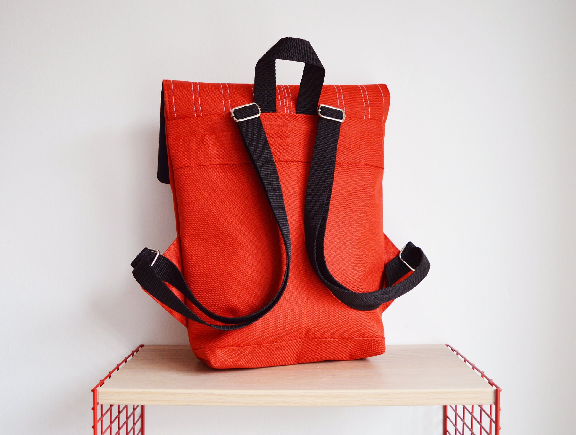 Backpack orange hipster backpack rucksack cycling bag everyday small mini backpack Zurichtoren geometric simple minimalist backpack water resistant waterproof brick red. It's made from orange waterproof cordura. Pockets on the blue lining. The bag has two way zipper and magnetic closure. It's a perfect everyday small bag.