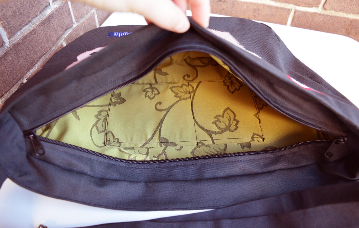 Unique design, high quality dark gray material. There are pockets in the upcycled lining, the bag has two way zipper closure.
