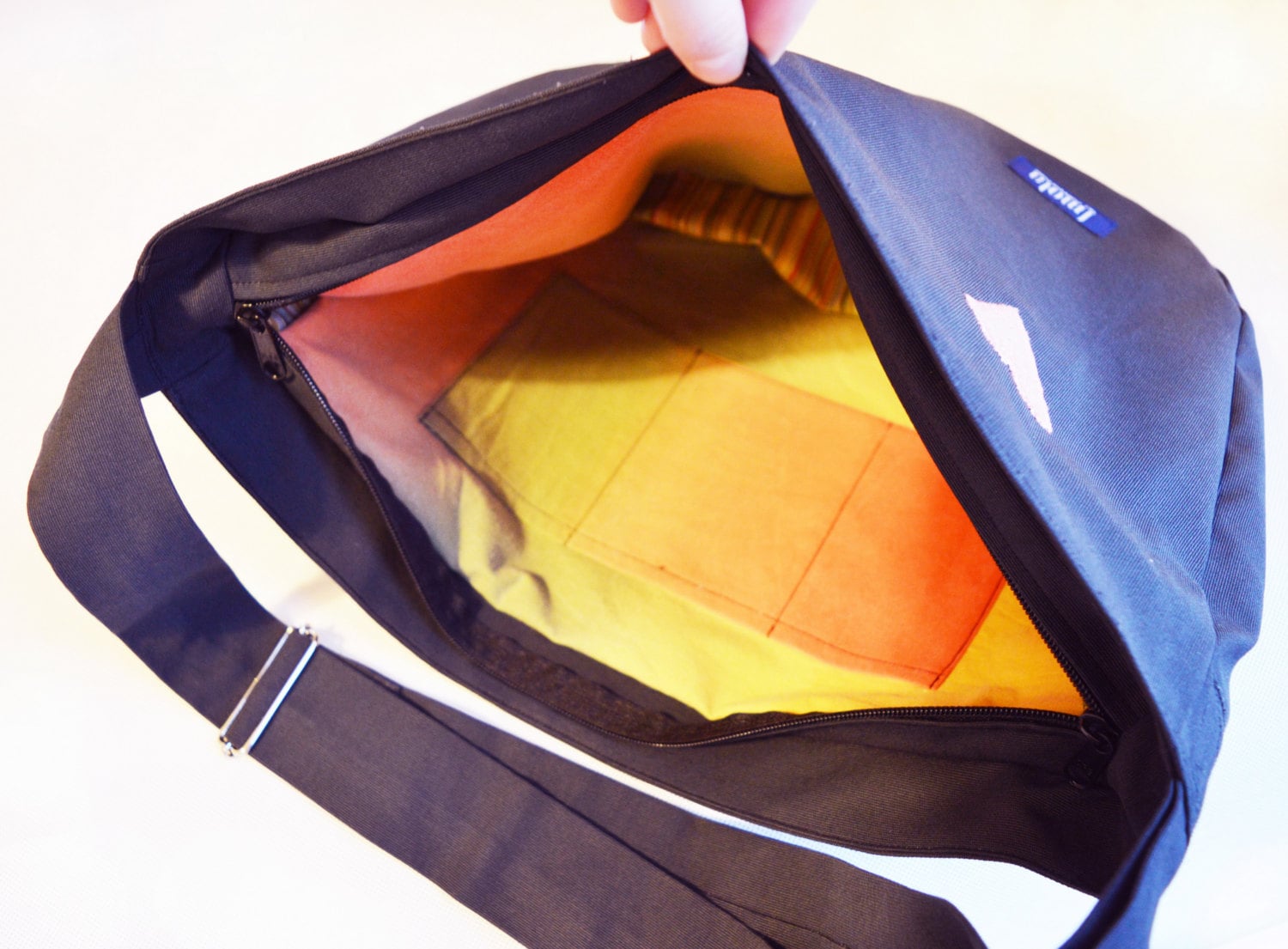 Unique design, high quality material. There are pockets in the upcycled lining, the bag has two way zipper closure.