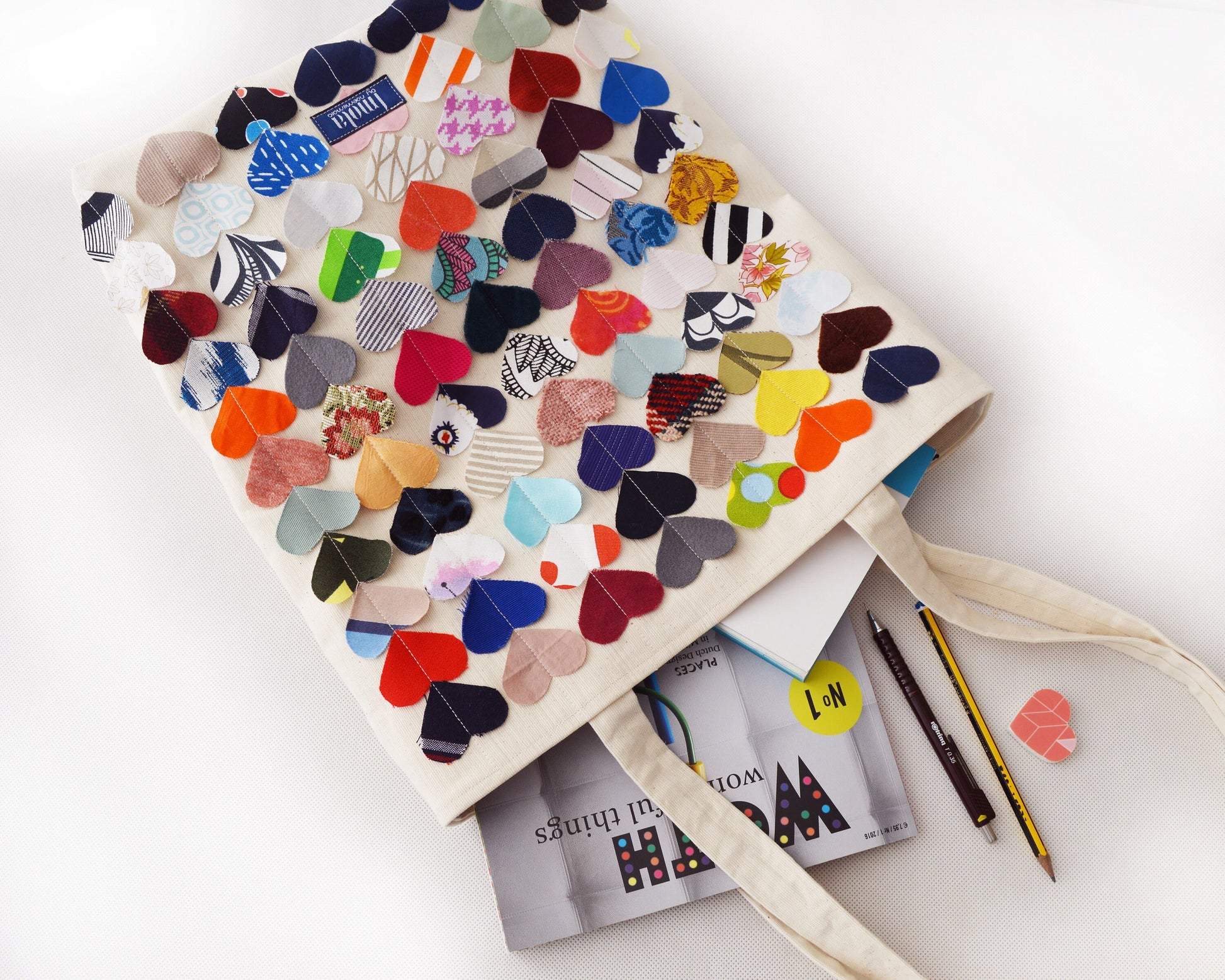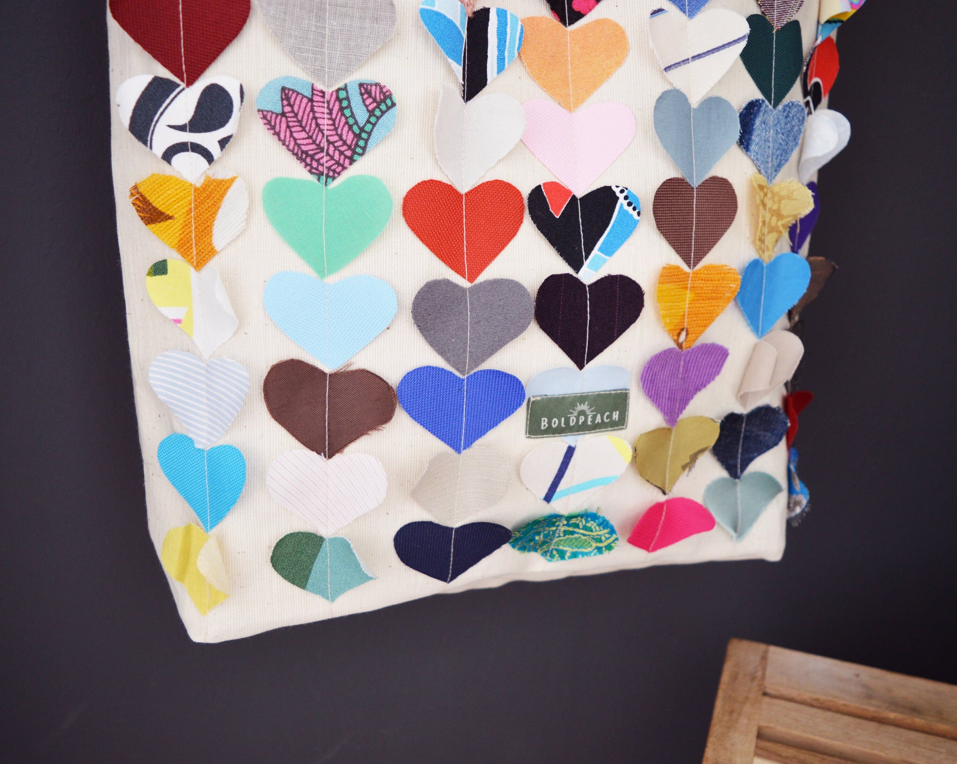 Colorful multi coloured canvas tote shopper bag beach bag beige rainbow hearts vegan bag tote bag happy hippie fun bag