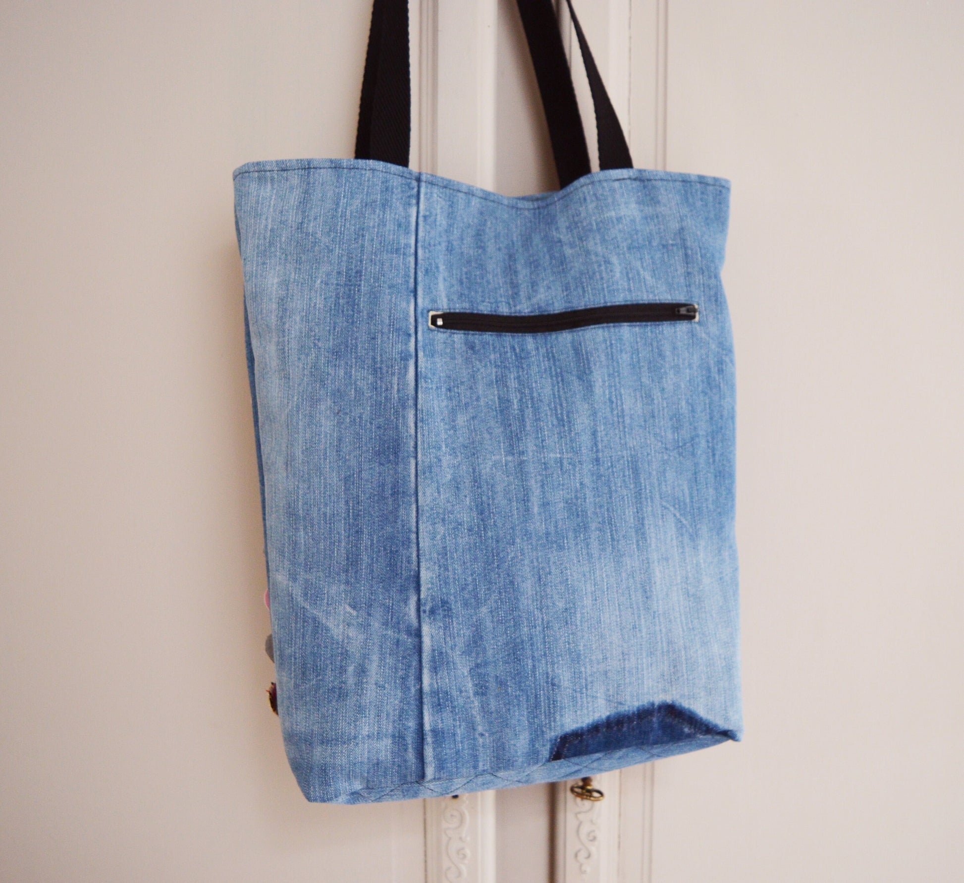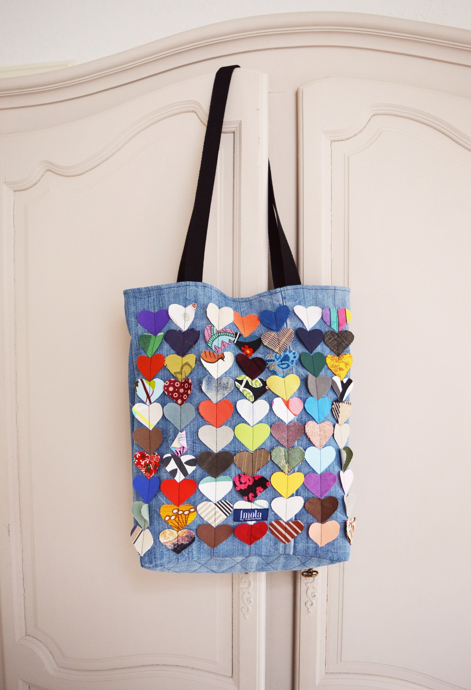 Colorful multi coloured canvas tote shopper bag beach bag blue recycled denim rainbow hearts vegan bag tote bag happy hippie fun bag. Colorful rainbow hearts on a recycled blue denim base. Zipper closure pocket on the back side, pockets on the recycled lining. The bag has magnetic closure. Super boheme shabby chic style tote bag, it makes your day happy! :)