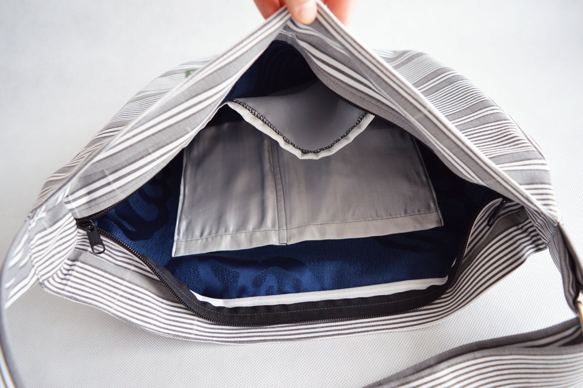 Gray white stripes crossbody bag bike messenger bag horizontal stripes. Unique design, high quality cotton material (upcycled). There are pockets on the upcycled lining. The bag has two way zipper closure.