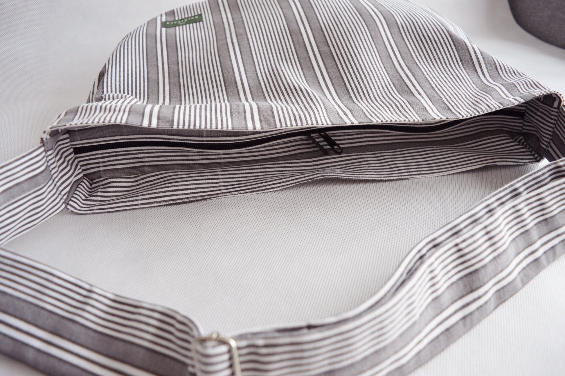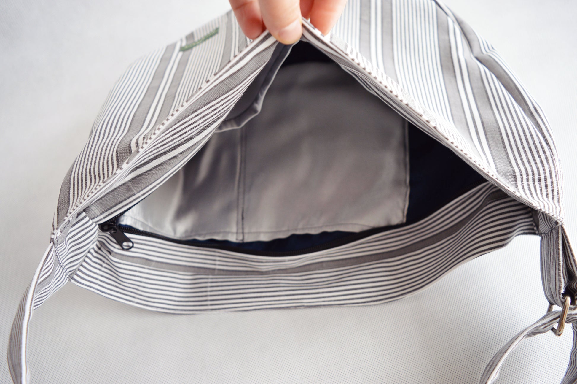 Gray white stripes crossbody bag bike messenger bag vertical stripes. Unique design, high quality cotton material (upcycled). There are pockets on the upcycled lining. The bag has two way zipper closure.