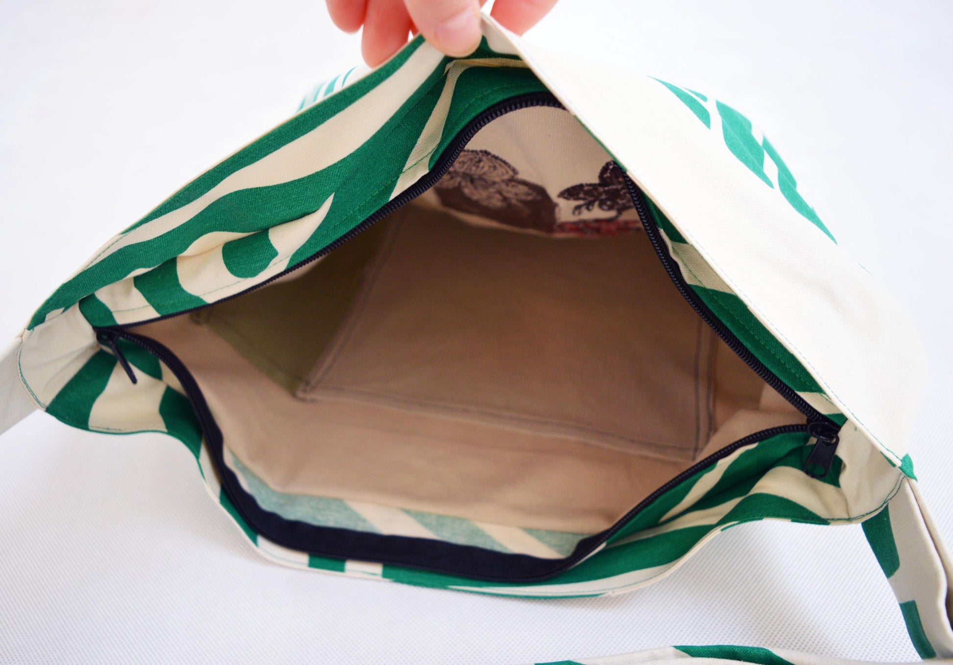 Unique design, high quality cotton material. There are pockets on the upcycled lining. The bag has two way zipper closure.