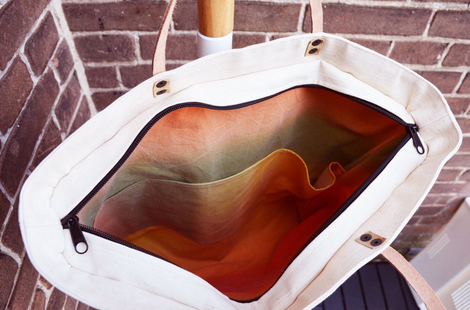 Large canvas tote bag shopping bag casual tote school bag orange brick red beige book bag weekender bag beige genuine leather strap for women fiesta. It's made from orange waterproof water resistant cordura and beige cotton. The straps were made from genuine leather, pockets on the upcycled lining and one zipper closure pocket on the back side. The bag has two way zipper closure. It's a perfect everyday bag.