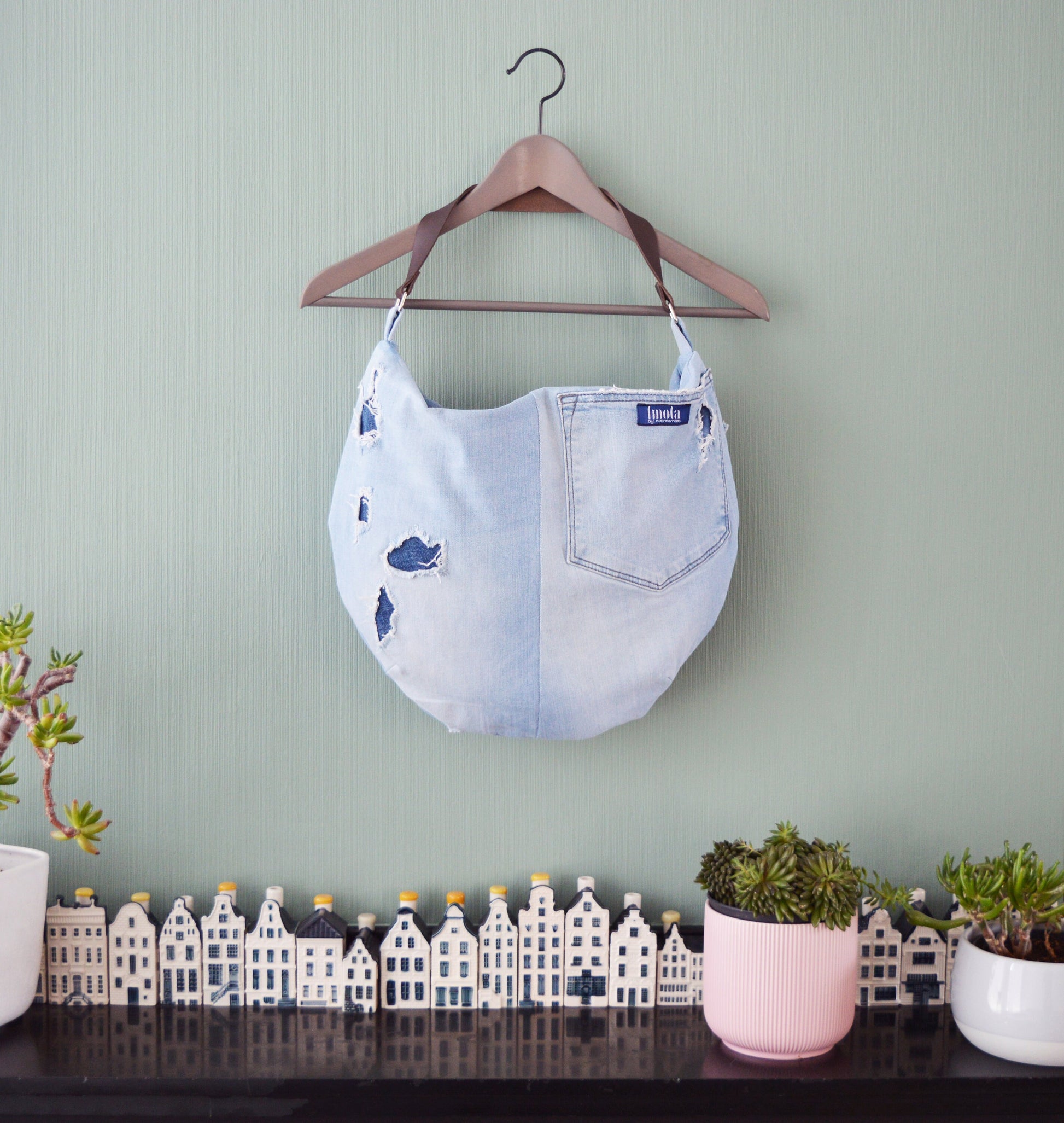 Large denim hobo bag light blue ripped jeans hobo tote bag with brown genuine leather strap for women shoulder bag handbag everyday bag