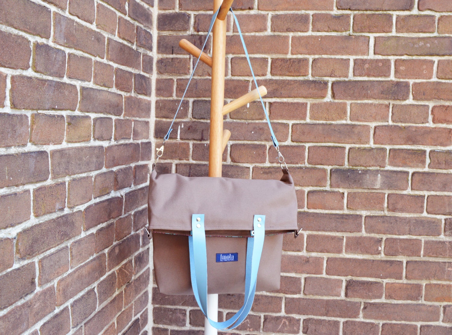 Large fold over canvas tote bag shopping bag casual fold over tote school bag book bag variable. It's made from brown cotton canvas and printed leaf pattern fabric. Straps are made from blue real leather. Pockets on the lining and one zipper closure pocket on the back side. The bag has two way zipper closure. It's a perfect everyday big bag.