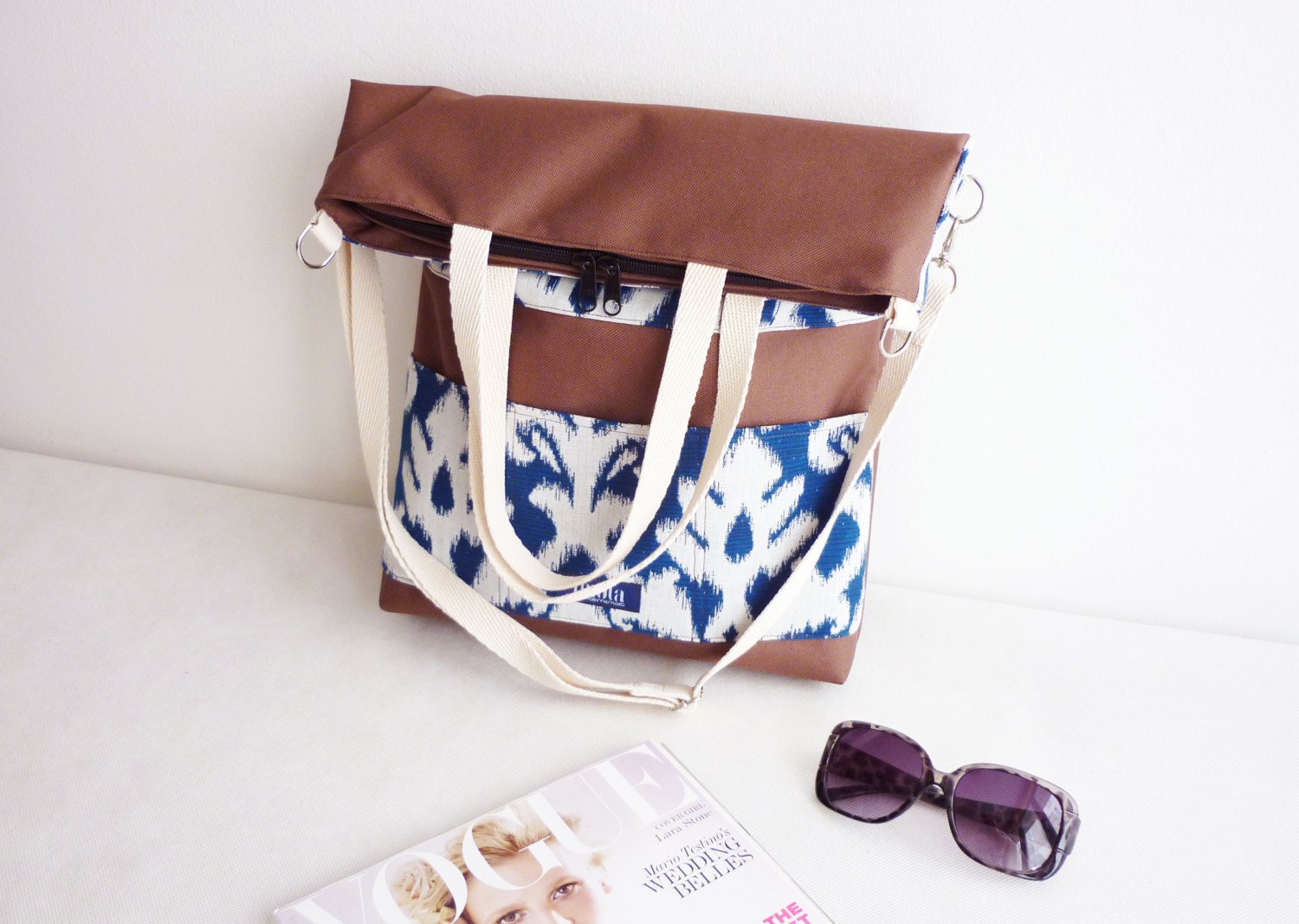 Large fold over canvas tote bag shopping bag casual fold over tote school bag brown damask brocade baroque book bag classy bag for women.It's made from waterproof water resistant brown cordura canvas and baroque pattern uv-resistant spanish designer fabric. Pockets on the lining and on the front side, beige cotton straps. Tha bag has two way zipper closure. It's a perfect everyday big bag.