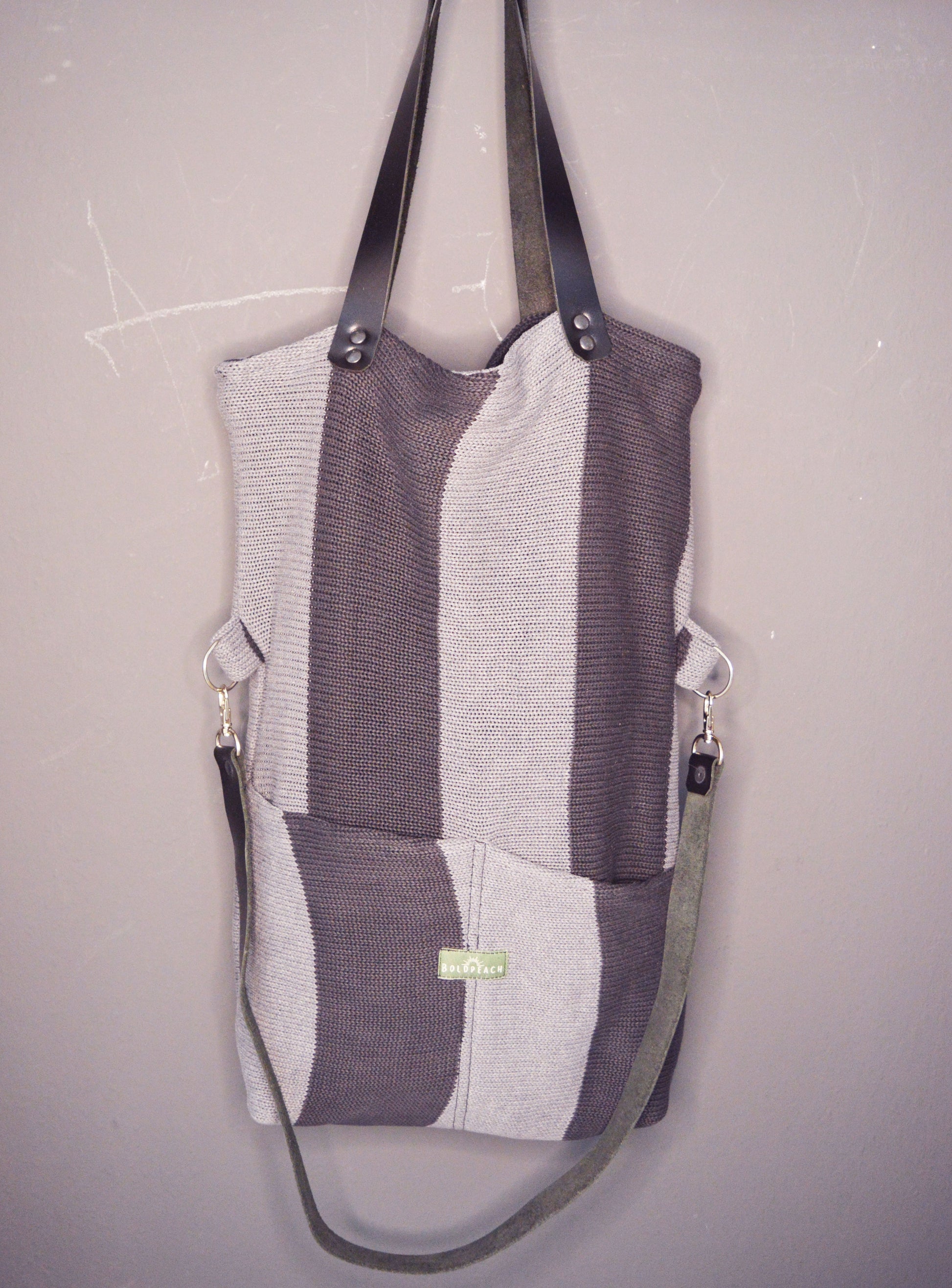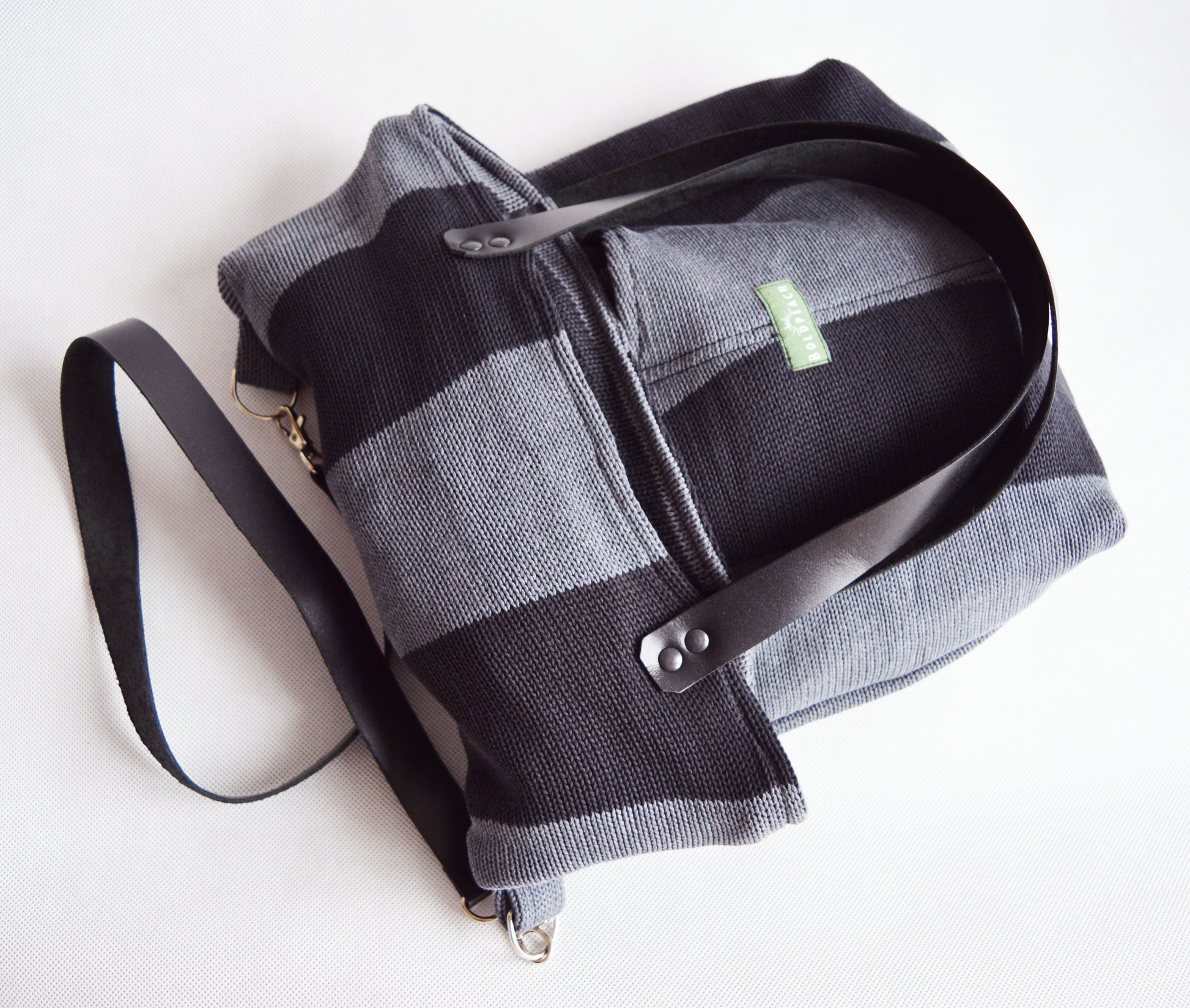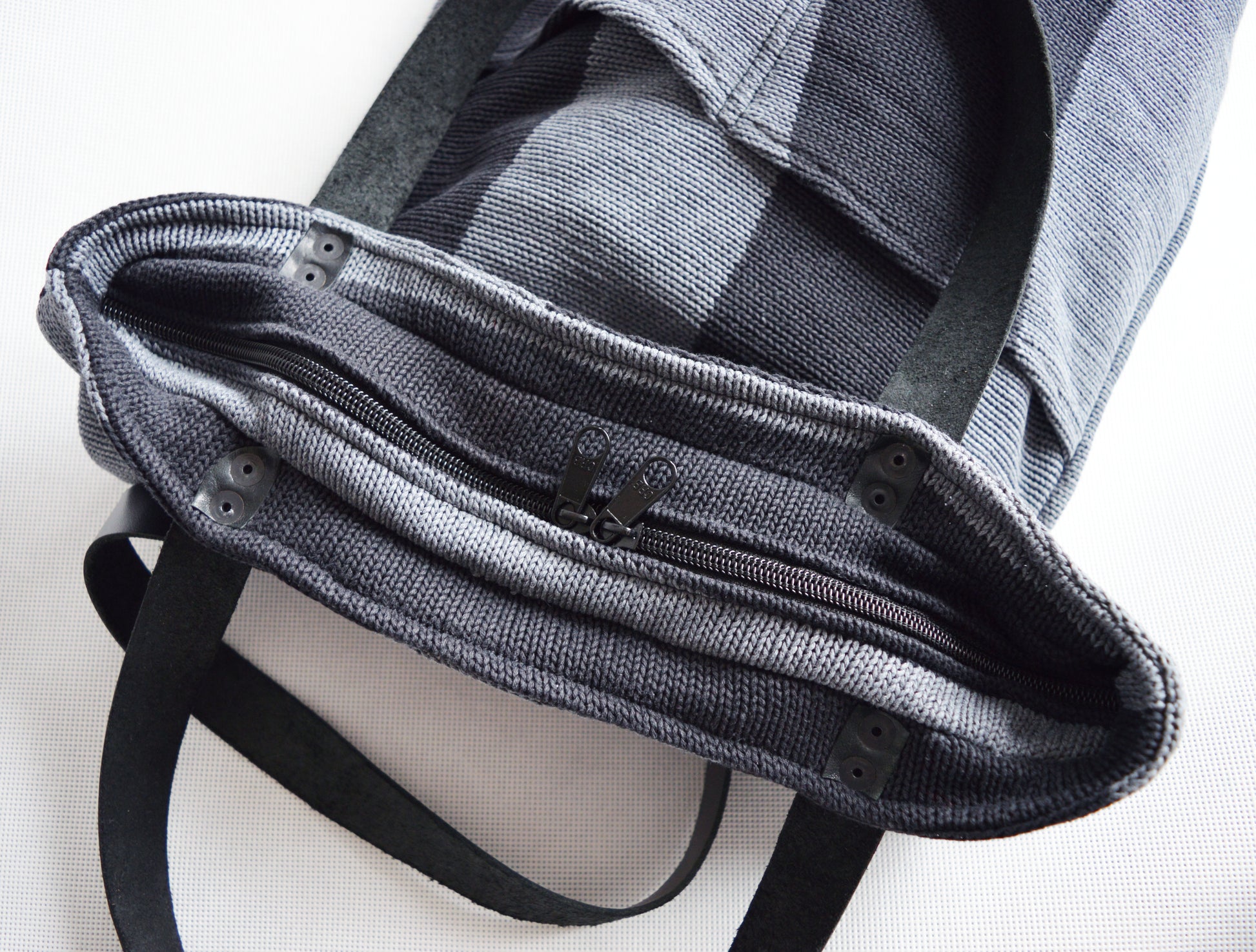 SALE Large fold over tote bag shopping bag casual fold over tote school bag black grey book bag variable tote crossbody messenger. It's made from upcycled knitted fabric and black genuine leather straps. It's quite soft because it's knitted, doesn't really hold it's form. Pockets on the upcycled lining and on the front side. The bag has two way zipper closure. It's a perfect everyday big bag.