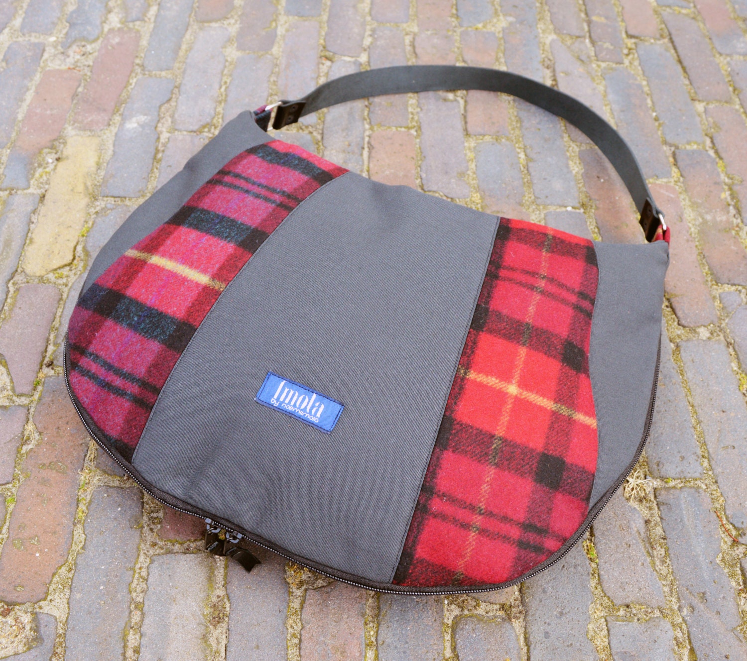 Plaid purse simple large purse handbag shoulder bag canvas bag country cottage chic western style real genuine leather black strap elegant everyday purse tartan expandable. It's made from burgundy plaid sqared canvas and dark gray cotton canvas and black geniune leather strap. Pockets on the upcycled lining. The bag has two way zipper closure. It's a perfect everyday shoulder bag.